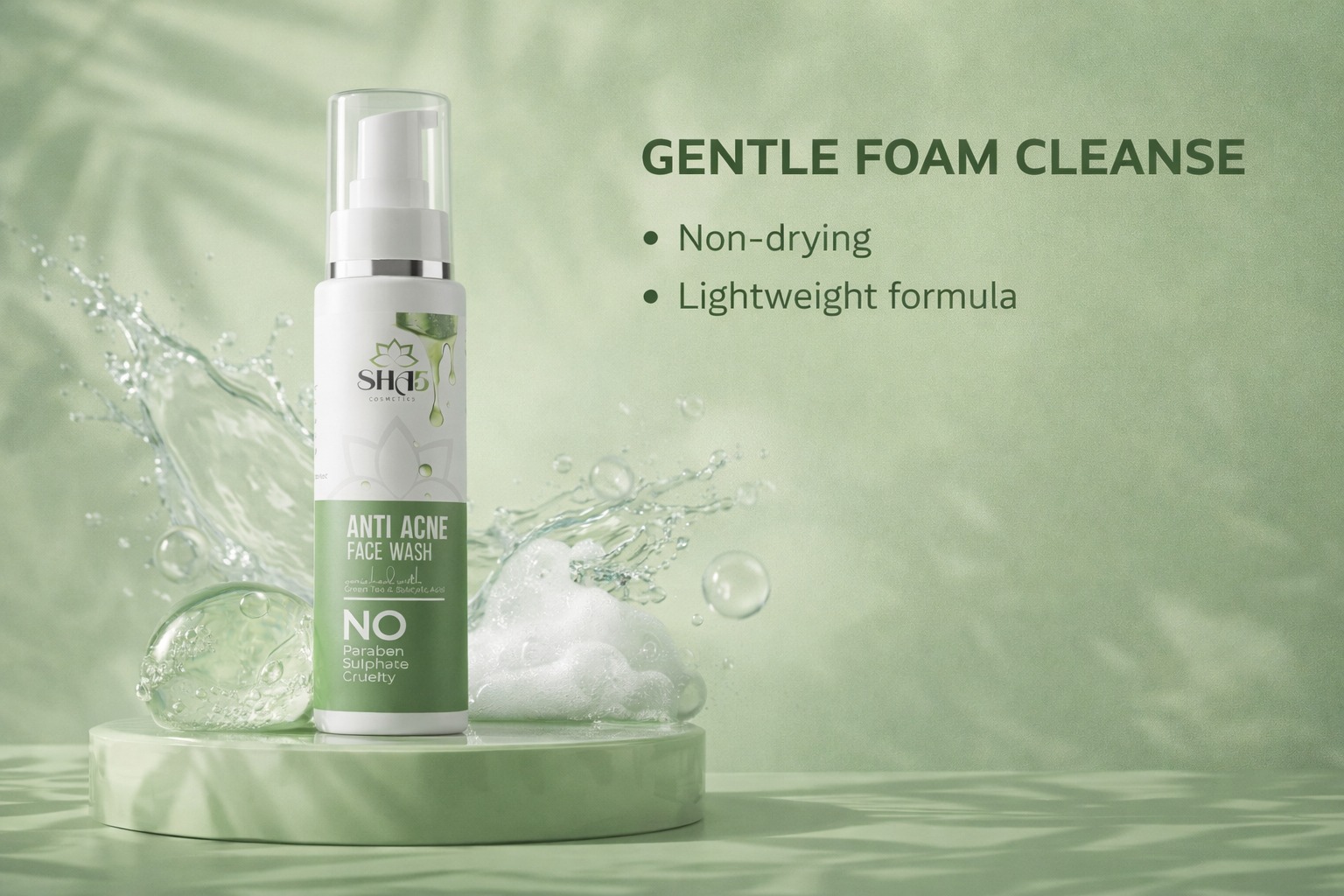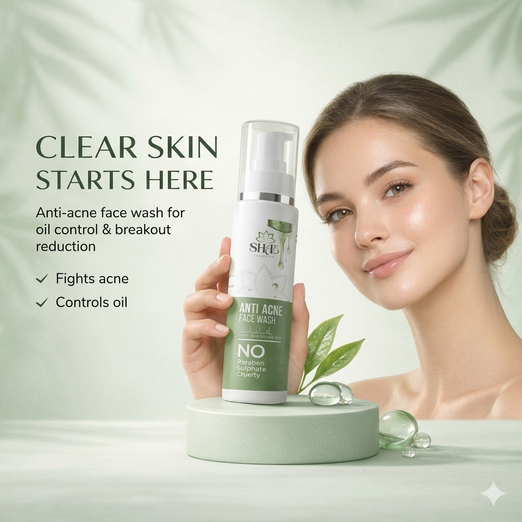 SHA5 Anti-Acne Face Wash is a gentle, daily-use cleanser enriched with coffee extract and aloe vera that helps control acne, deeply cleanses pores, and brightens skin. It removes excess oil, dirt, and impurities without over-drying, leaving the skin fresh, clear, and healthy-looking