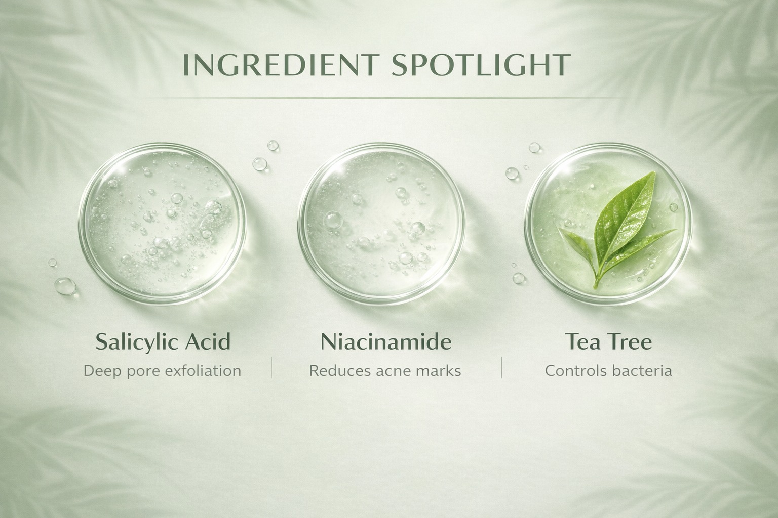 Aqua (Water), Salicylic Acid, Niacinamide, Aloe Vera Extract, Glycerin, Hyaluronic Acid, Green Tea Extract, Vitamin E, Preservatives (as per cosmetic standards).